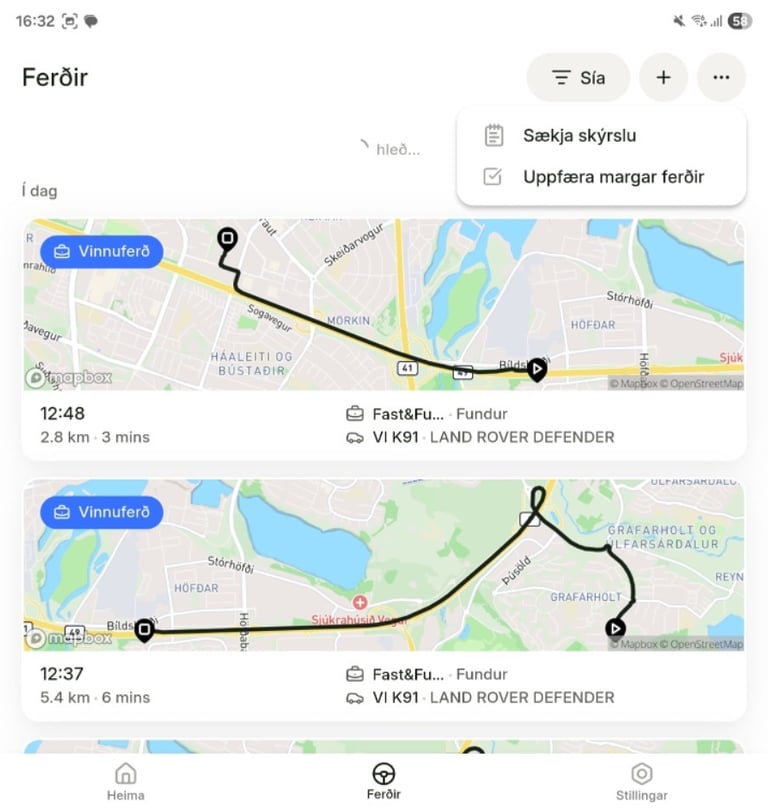 Forsíðan sýnir þér allar ferðir sem eru að safnast upp en hérna var ég að keyra fyrir Fast & Furious ehf og eins og sést eru þetta 18 ferðir, 362km og ökutækjastyrkur uppá 49.573kr þann 08. febrúar, það eru rétt um 400.000 kr á ári en mánuðurinn er auðvitað bara rétt byrjaður.