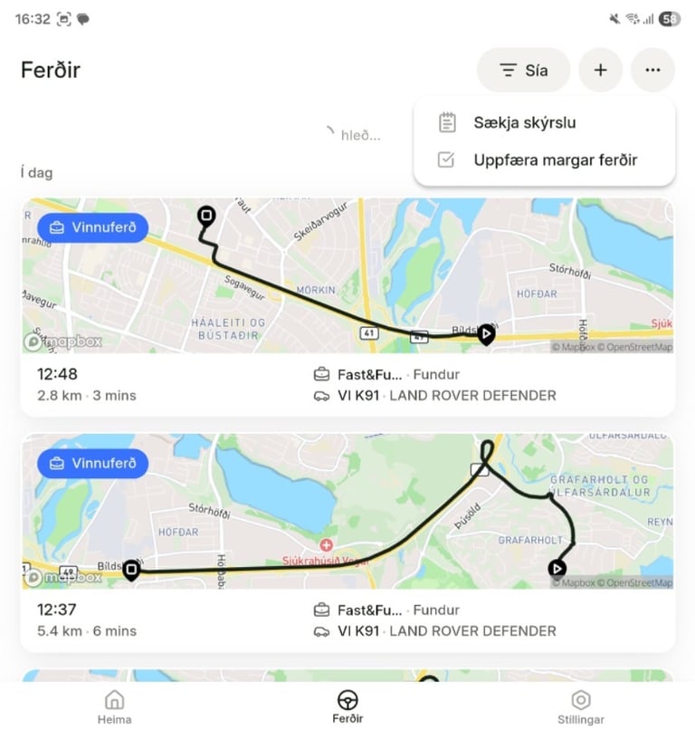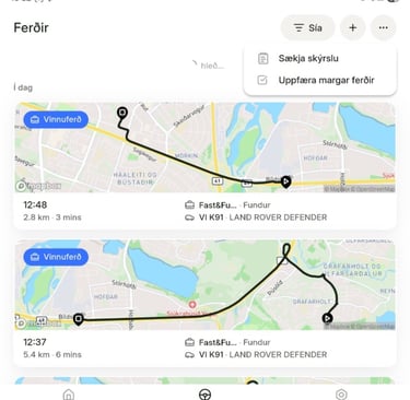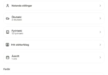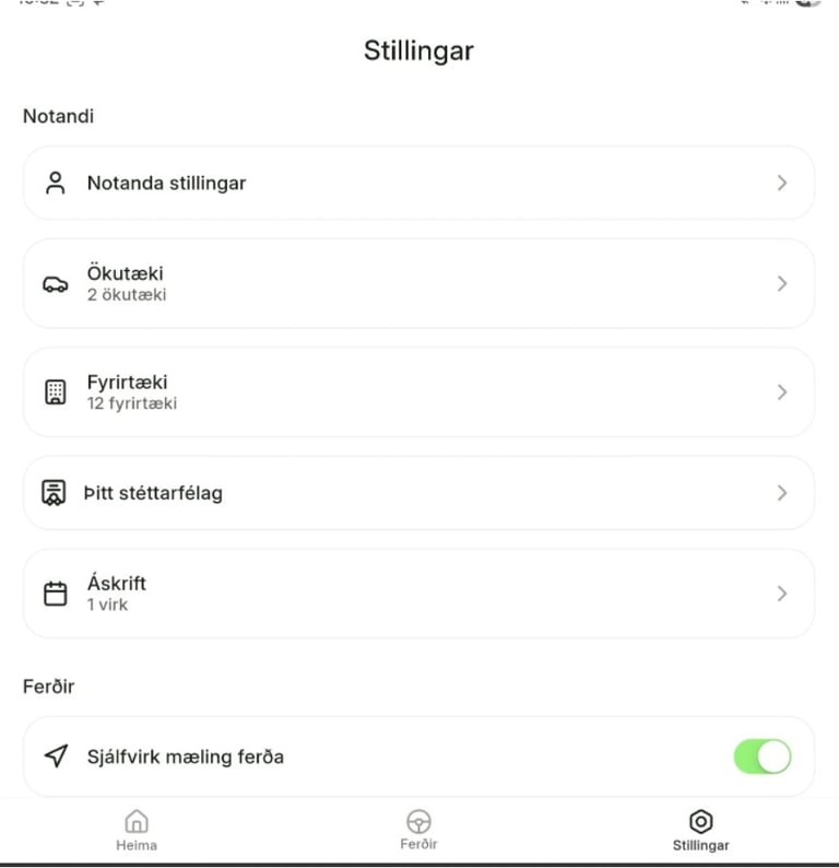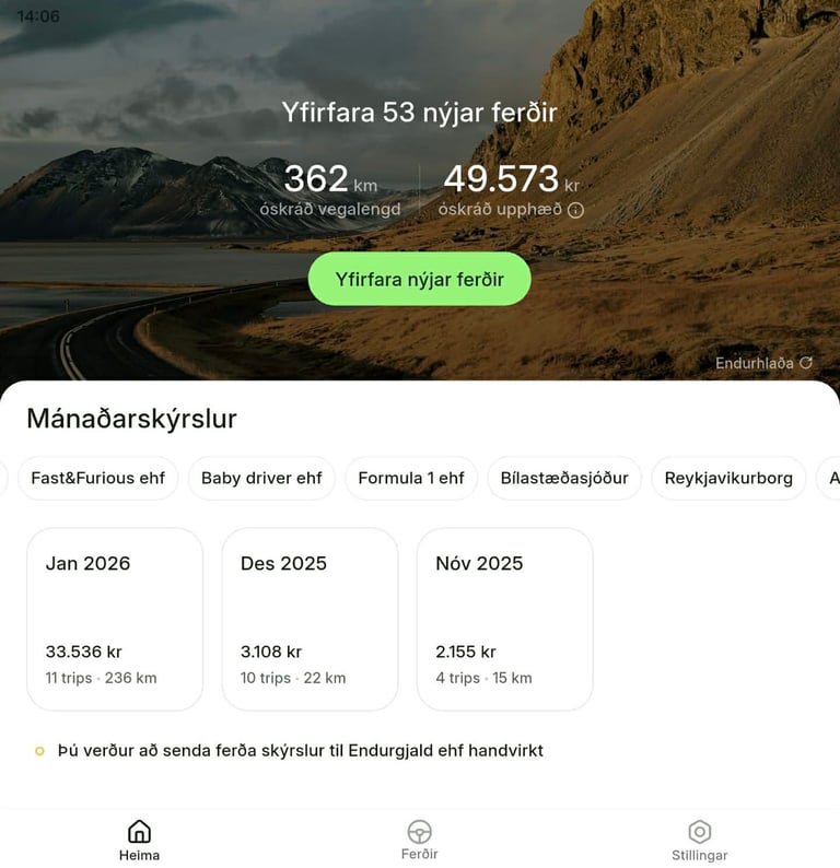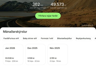 Forsíðan sýnir þér allar ferðir sem eru að safnast upp en hérna var ég að keyra fyrir Fast & Furious ehf og eins og sést eru þetta 18 ferðir, 262km og ökutækjastyrkur uppá 49.573kr þann 08. febrúar, það eru rétt um 400.000 kr á ári en mánuðurinn er auðvitað bara rétt byrjaður.