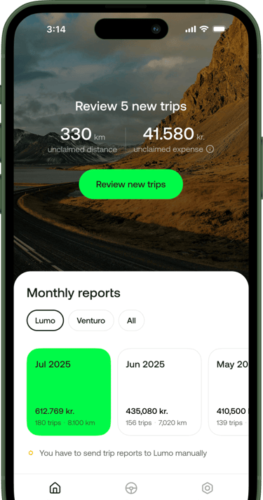 The Skreppa app automatically captures trips, including where you drove from and to, and the number of km driven. All you need to do is select the business trips and define the purpose of the trip and then submit the monthly report for approval and payment.